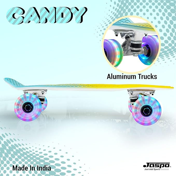 Jaspo Candy Kids Skateboard Yellow Blue with 22 inch fiber deck, LED wheels and sturdy trucks for a smooth stylish ride