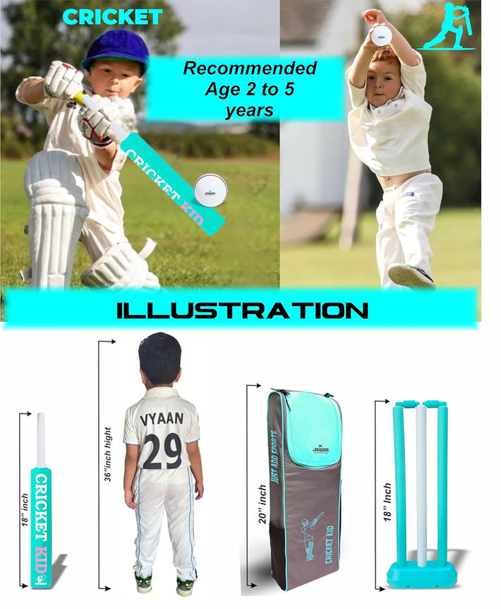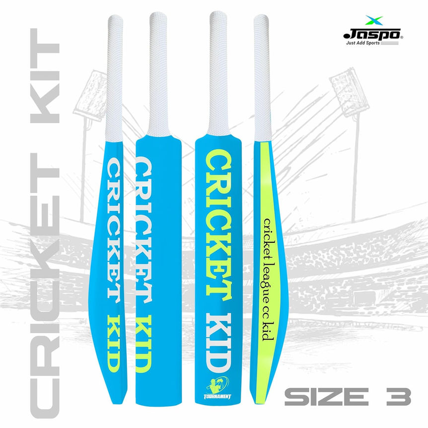 The Jaspo CRIC Addict Set comes in Size-1 (2–5 yrs), Size-3 (5–10 yrs), and Size-5 (7–10 yrs). It includes a bat, ball, stumps, and carry bag—lightweight, durable, and perfect for fun indoor or outdoor play