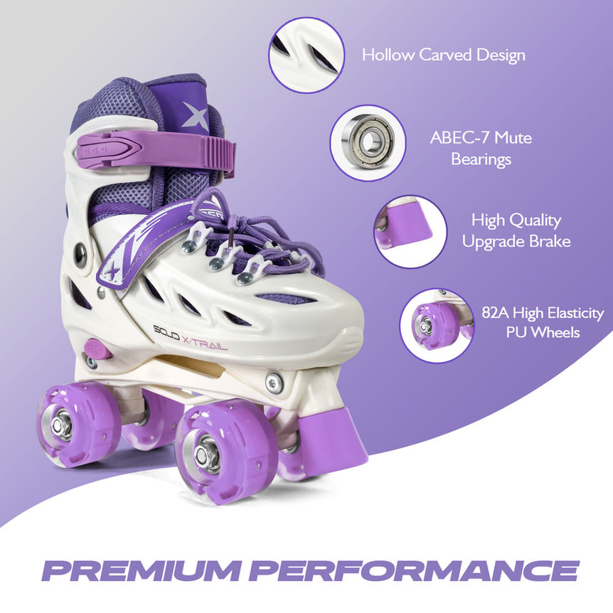 Jaspo Scud X Trail Adjustable LED Quad Skates with PU wheels, durable sole, and vibrant lights, ideal for indoor/outdoor use. Available in Blue-Grey, Purple-White, and Black-White, sizes Small, Medium, and Large.